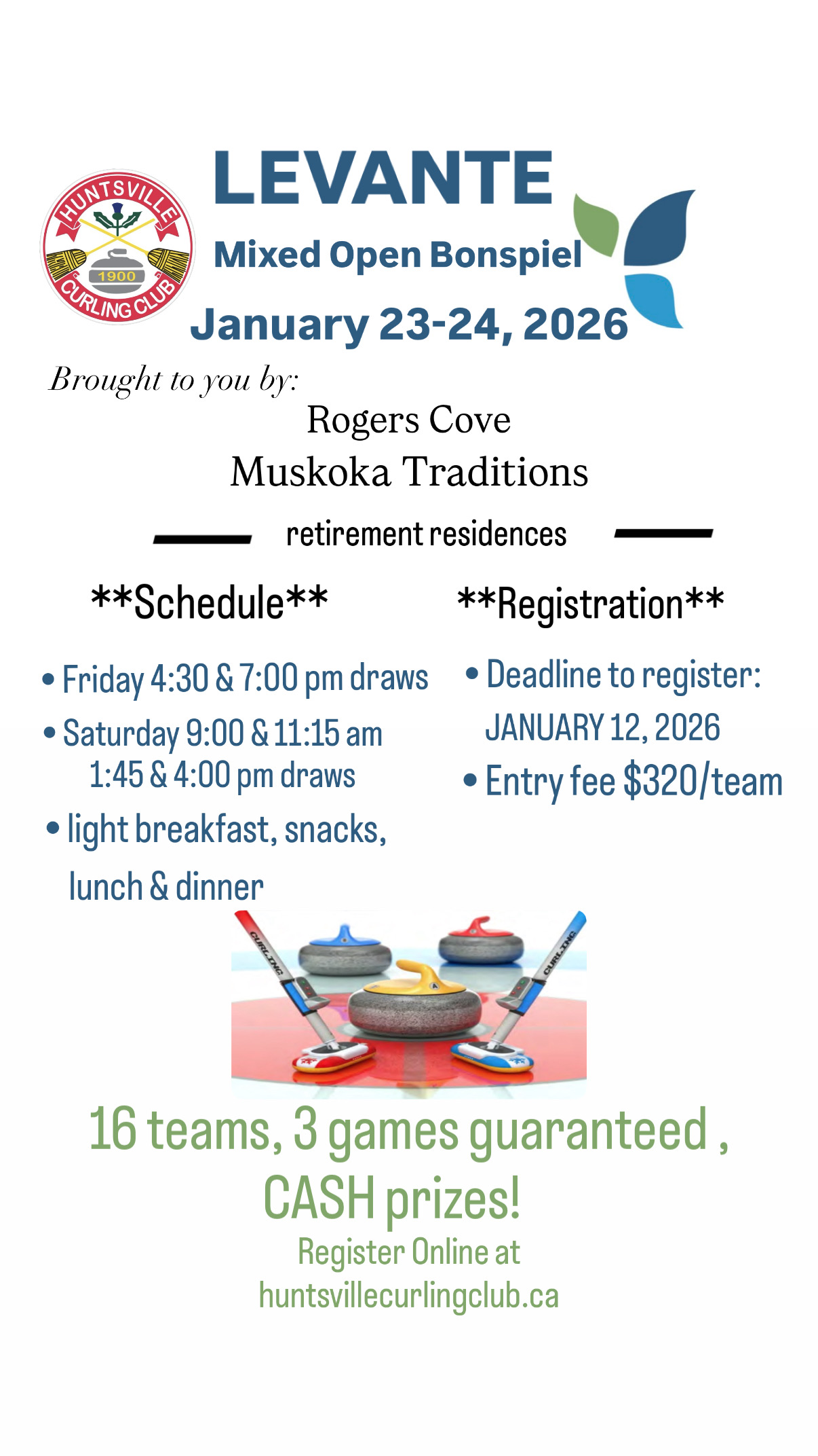 Huntsville Curling Club - Levante Mixed Open Bonspiel - Friday, January 23, and Saturday, January 24, 2026.